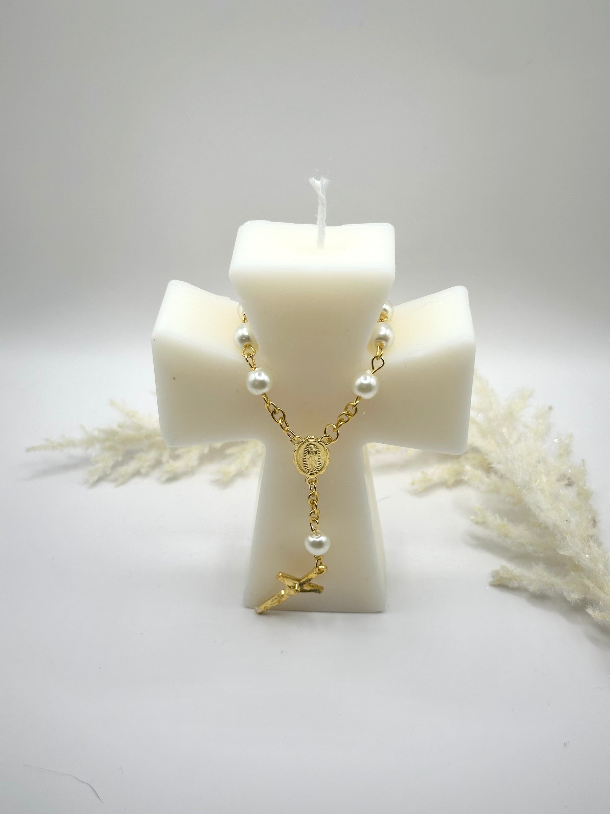 - Notre bougie en forme de croix chrétienne, ornée d’un chapelet doré avec des perles et une médaille religieuse, est une pièce très symbolique et originale.