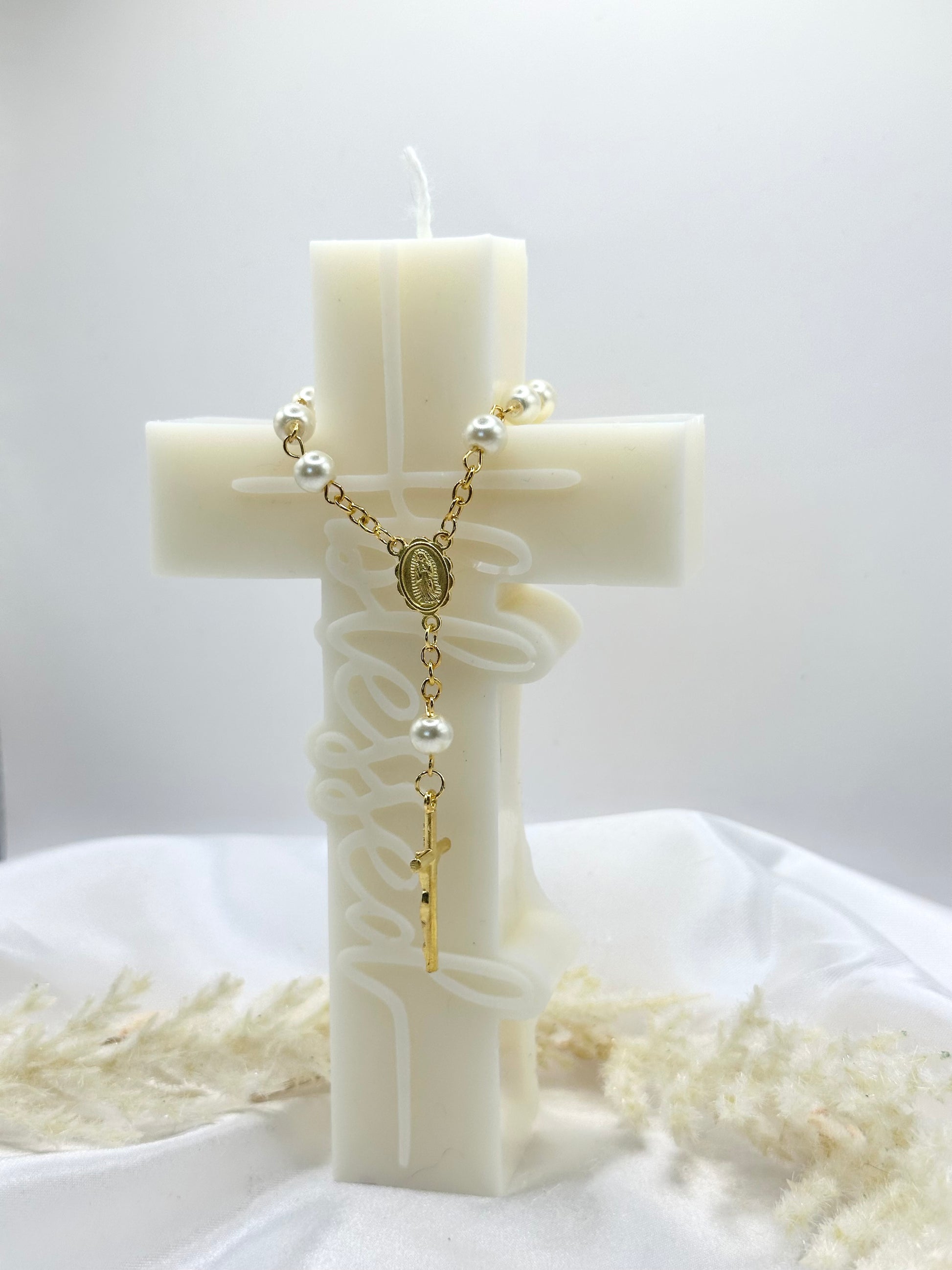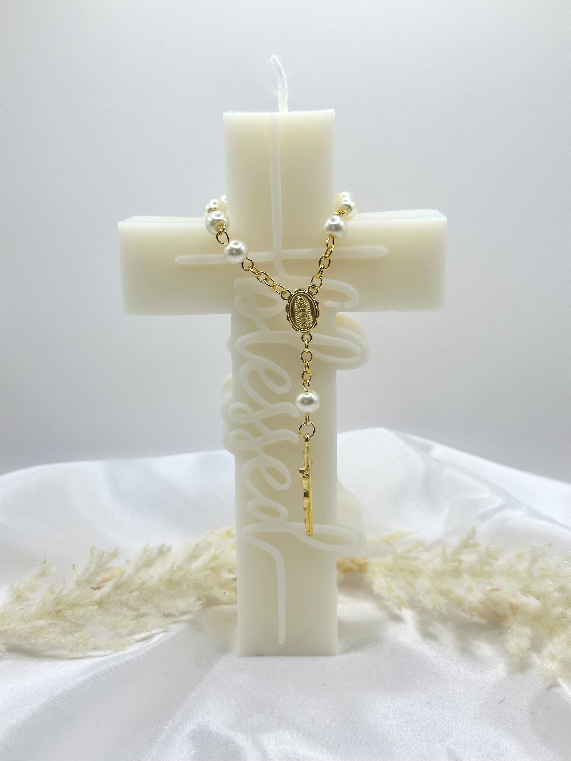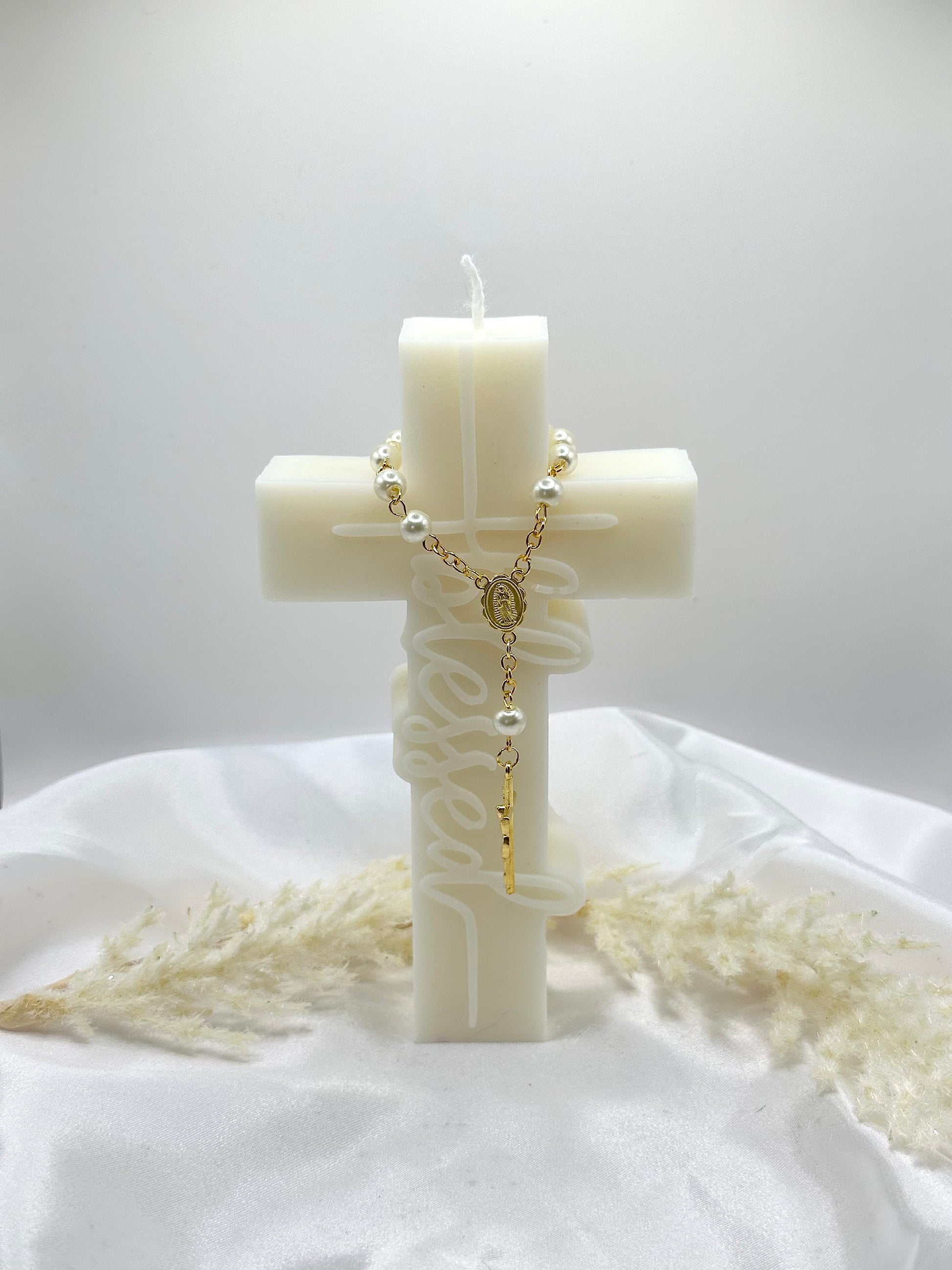 - La bougie croix- Blessed avec chapelet est un objet de décoration religieux unique, parfait pour apporter une ambiance spirituelle à votre intérieur.